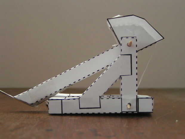 Este trebuchet es demasiado pequeña para un arreglo complejo como eso, así que la cadena entera va con la munición, haciendo pivotar un gancho o pasador en el extremo del brazo.
