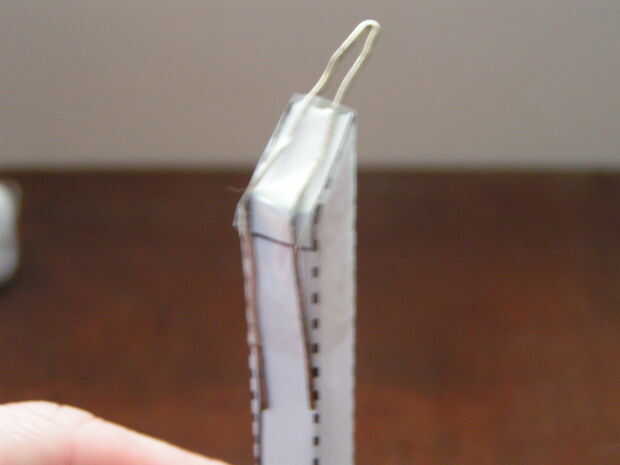 Doble otra vez para coincidir con la forma del extremo del brazo de disparo y el clip doblado en la parte inferior del brazo de disparo, sobresale aproximadamente medio centímetro de la cinta.