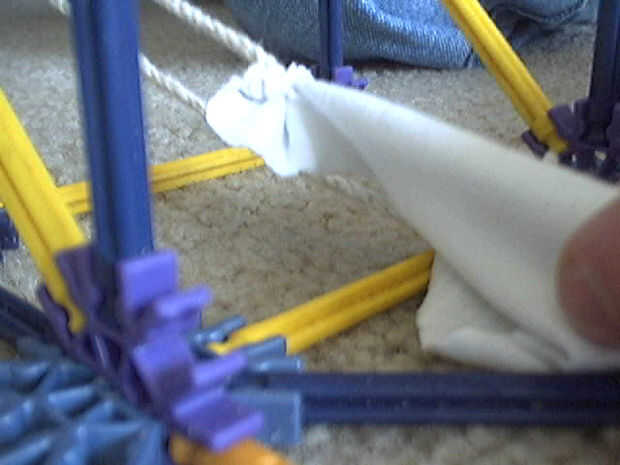 6 Tire la bolsa enseñó y asegúrese de que no hay bucles... debe ser el lado del lazo en la parte inferior, y el lado atado para el brazo debe estar en la parte superior.