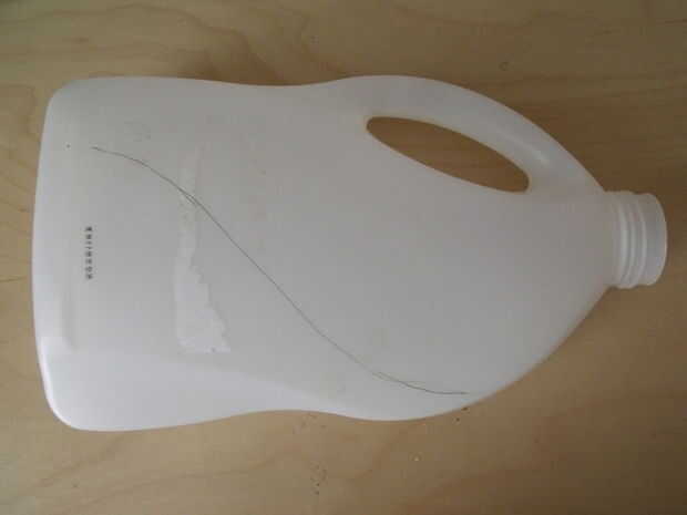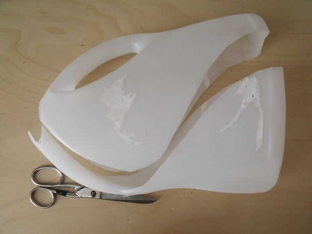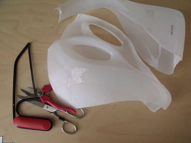 Mayoría de las botellas con un mango se puede cortar como en este ejemplo. El agujero del mango se convierte en ojos. Deje la parte superior de la botella amplia, estrechamiento hacia abajo hacia la nariz. Esto se convertirá en los lados del cráneo. dividirla en dos mitades iguales. Tenga en cuenta que el interior de la empuñadura también debe cortarse en mitades. Suena más complicado de lo que realmente es. El triángulo en la parte inferior se convierte en una frente. Corte del cuello de la botella con una pequeña sierra y cortar otros linse con un par de tijeras normales. Para partes más gruesas de la parte inferior he utilizado pequeñas todas las tijeras de propósito.