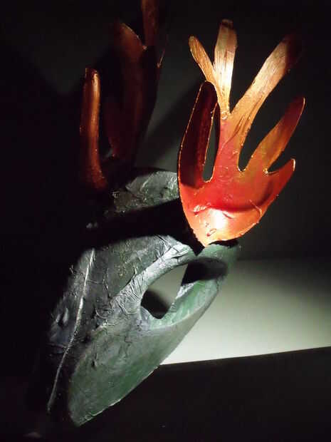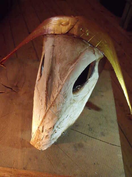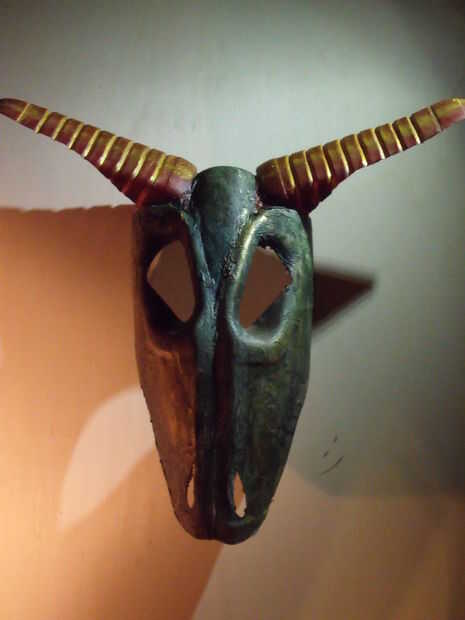 Todo lo pinté con acrílico artista colores. Hay sabe qué colores son necesarios. El cielo es el límite. Usted podría pintar más o menos color hueso; blanco, ocre, gris. Algo me gusta de un verde bronce. Primero una capa de negro, entonces no cubriendo el negro una capa verde (chroomoxide) y algo de oro en los bordes. Pero el azul también pueden ser atractivo. Cuidado con rojos, es rápidamente asociado con sangre en estas cabezas. Para cuernos he utilizado cobre y oro la mayoría de las veces.