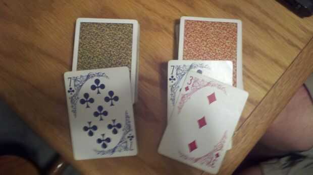 1) abrir ambas bandejas. Quitar las tarjetas promocionales y comodines de la baraja roja. Desde la cubierta azul, sacar la tarjeta azul truco (azul 7 de clubes) y póngala a un lado. De la baraja roja, retire la tarjeta de truco rojo (rojo 7 de clubes) y rojo tarjeta ficticia (rojo 3 de diamantes).