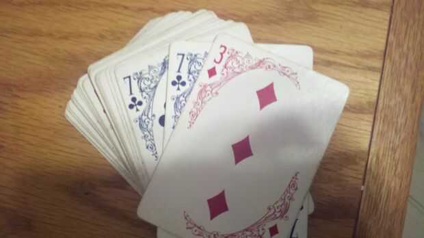 2) tome la cubierta roja. Coloque la red 7 de clubes en la parte inferior de la cubierta roja. Ahora coloque el azul 7 de clubes en la parte inferior de la cubierta roja. Ahora coloque el rojo 3 de diamantes en la parte inferior de la cubierta roja. Tus cartas de la parte tres inferior deben ser el 3 de diamantes, el azul 7 de clubes y el rojo 7 de clubes de abajo hacia arriba.