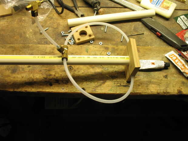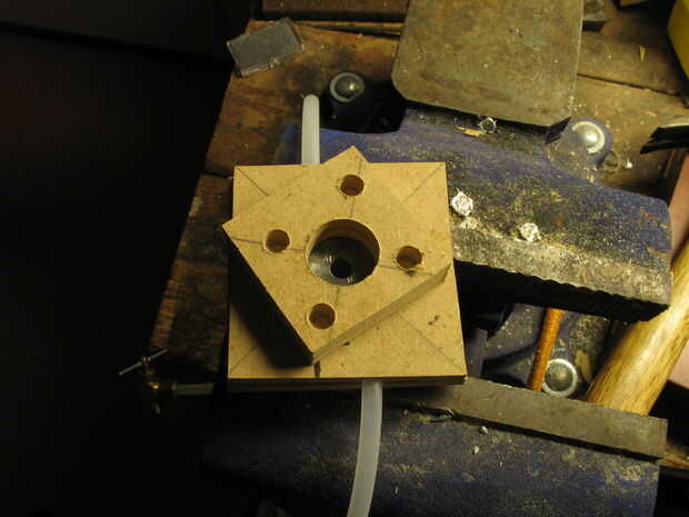 Centro hasta el agujero en el segundo 4 x 4 acrílico cuadrado tú a un lado y perfore cuatro o así que los agujeros y con los pernos y tuercas, fije las dos piezas. Vuelva a colocar la tubería caliente (mire por los agujeros y línea de ellos para arriba, duro, lo sé, pero te figura una manera de, como iluminar el tubo con una linterna o algo para hacer el agujero visible) y conecte la tubería fría.