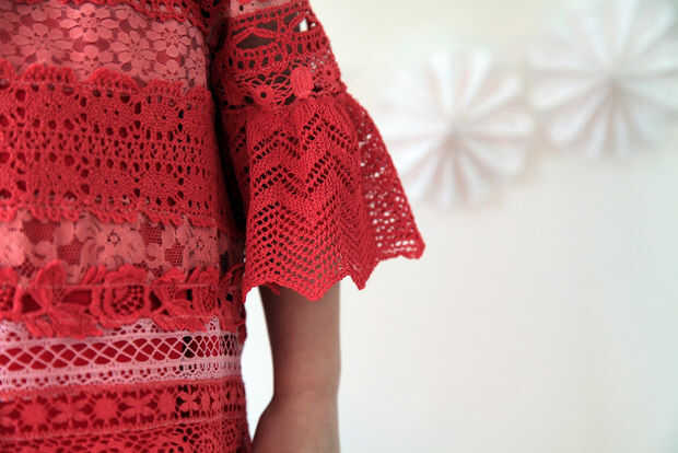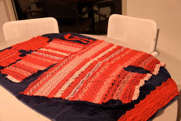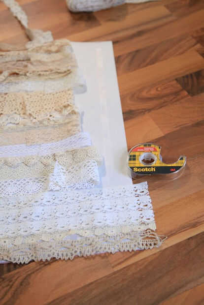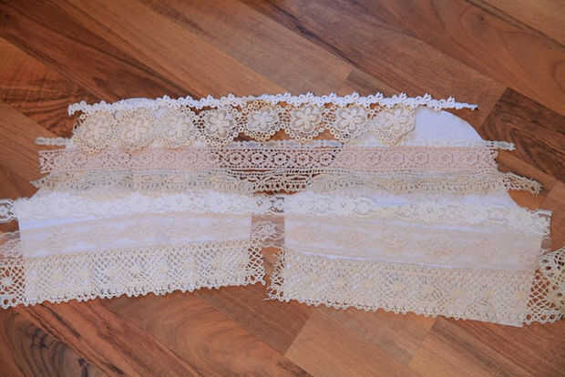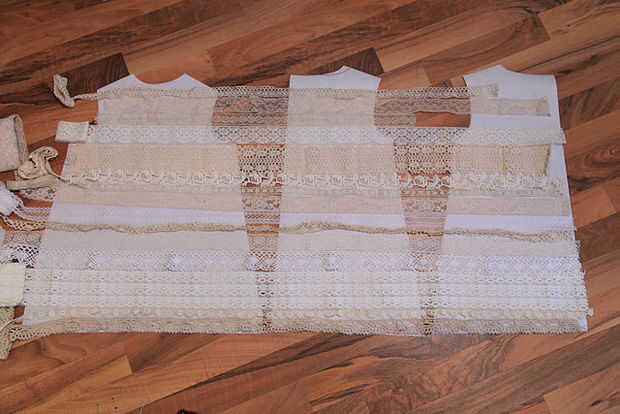 2) pone su encaje sobre las piezas, alineadas, por lo que coinciden en las costuras cuando lo consigues cosidas. Averiguar cómo quiere organizar sus cordones, pero no empiece a cortar todavía. Se superponen la puntilla con otro solo un poco. Puede agregar uno más en la parte inferior, en caso de coserlas juntos más comprometidos que usted pone hacia fuera. Asegúrese de que tener suficiente cantidad de cada ajuste del cordón para todas sus piezas. Equivocó en uno de mis hilos y tuvo que sustituir a otra pieza, pero no quieren arriesgarlo.