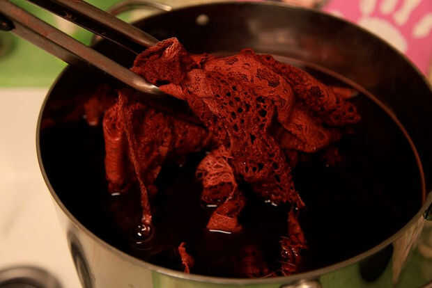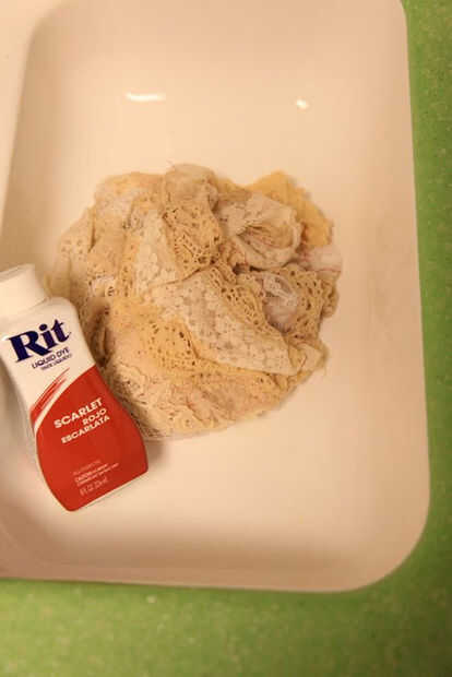 3) mojar el cordón y preparar el baño de tinte. A mina en la estufa en una olla grande. Experimento con un trozo antes de poner ese encaje. Es muy emocionante! Incluir cualquier otra pieza se podría agregar al vestido: teñido solo piezas de encaje que yo estaba añadiendo a las mangas y alrededor del cuello.