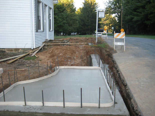 Durante el vertido #4 (. 500") rebar se colocó en el hormigón húmedo. Más adelante más barras de refuerzo para los muros serán vinculado a estas barras, por lo tanto conectar físicamente el refuerzo de las paredes y los pies de página.