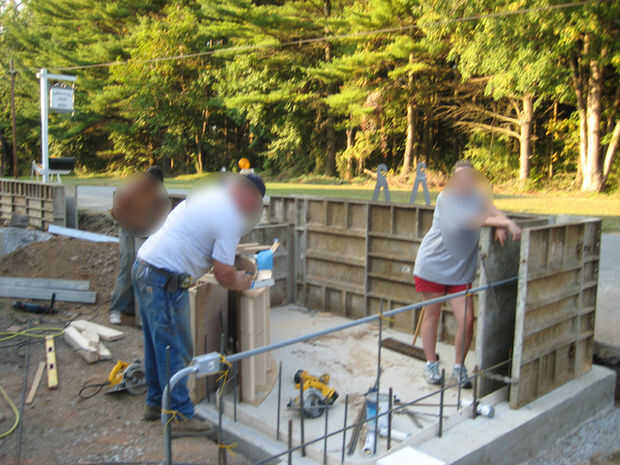 Antes de configurar las formas (que se colocan al lado de la foto de abajo) se llegó a una línea de cuerda de tiza. Era vital para mantener todas las formas alineadas y no tienen deficiencias en las formas. Las formas están conectadas por pasadores (ver agujeros abajo en el primer cuadro) y placas de metal que unir ambos lados de las formas, manteniéndolas paralelas (ver figura #3 abajo). Estas chapas están contenidos en el hormigón durante el vertido. Después de que el hormigón se vierte y configurar, estas placas metálicas quedan sobresaliendo aproximadamente 1" en cada lado de la pared (esto es donde fueron conectados a la chaveta). Toma un martillo y golpeó a presión el extremo, se rompen fácilmente y al ras con la pared cada vez.