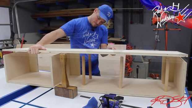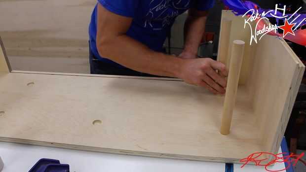 Ahora que se hacen todas las mortajas, surcos y mortajas para los tacos, se puede montar posteriormente. Va juntos como un rompecabezas que es ideal para seco colocándolos junto primero. Los tacos son para el gabinete de centro que sostiene las abrazaderas no esenciales como resorte, C y las pinzas de agarre rápido. Asegúrese de que los soportes pero hasta el montaje calas para que la grapa de montaje se ve en la superficie superior de la abrazadera de la abrazadera. Usar buen pegamento y tornillos para reforzar las articulaciones para no estante.