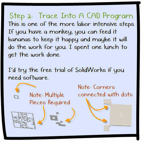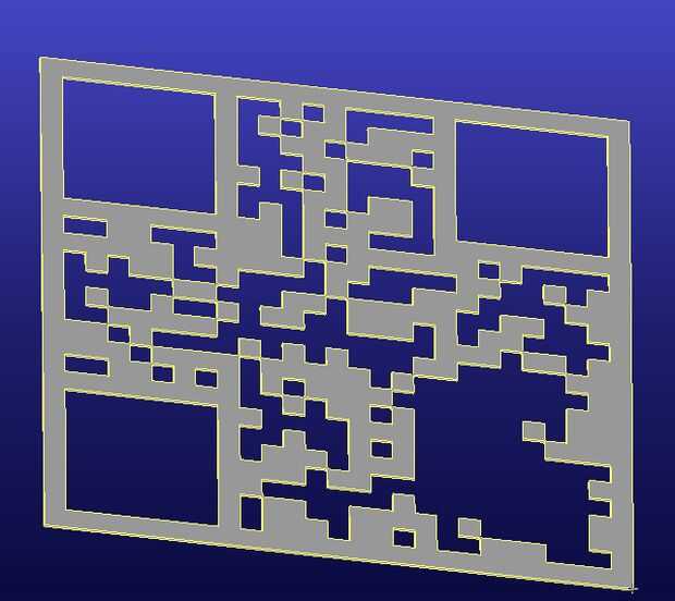 Rastrear el código QR en un programa de CAD.  Me tomó cerca de una hora del almuerzo.  Que también algunas de las piezas de esquina conectado así que no serían "filos".  Los códigos son bastante robustos y perdonando para adornos pequeños como ese.