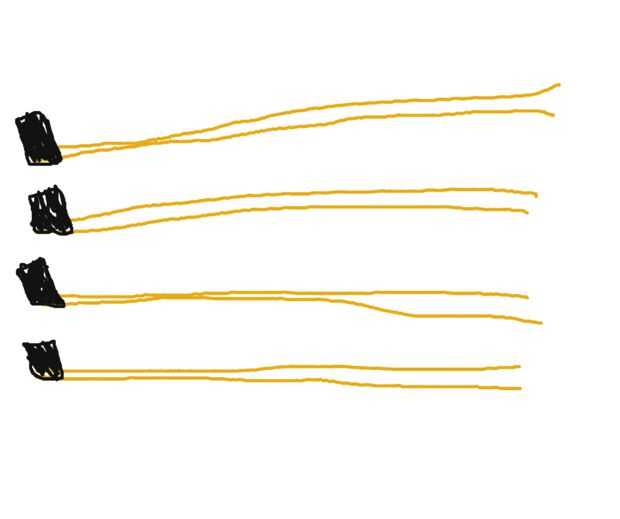 Para cortar alambre simplemente medir longitudes de alambre sobre la longitud de las barras de metal en su paraguas y cortar! Necesitará dos cables para cada una varilla que desea iluminar. Elegí a cuatro barras (barra otros) por lo que cortar ocho trozos de alambre. Una vez que haya terminado de cortar el alambre hacia fuera, pares de cinta juntos (un par por barra) al final de cada uno de los cables con cinta aislante como se muestra en el dibujo anterior.