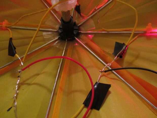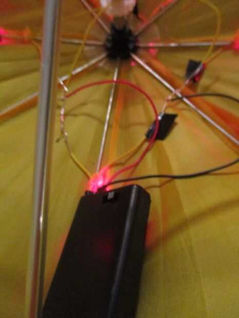Simplemente soldar el cable rojo del soporte de la batería a cualquier parte de los cables positivo y el cable negro a cualquier parte de los cables negativos! Activar el soporte de la batería para probar. Si todo ha ido bien, el paraguas todo se ilumina!