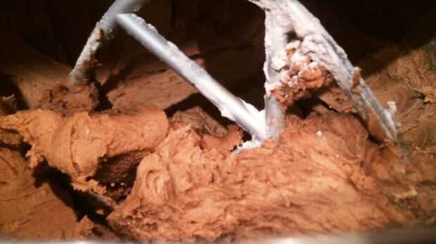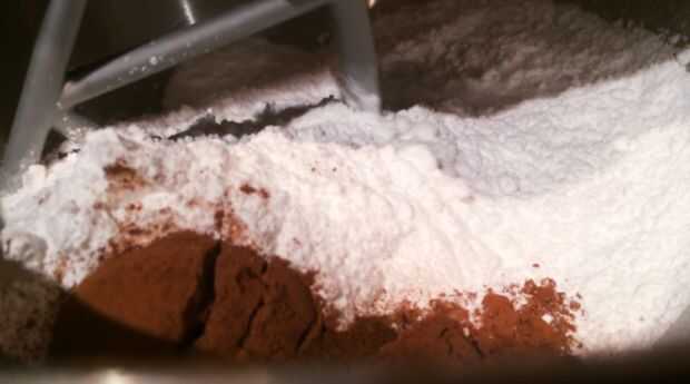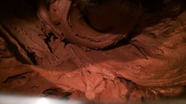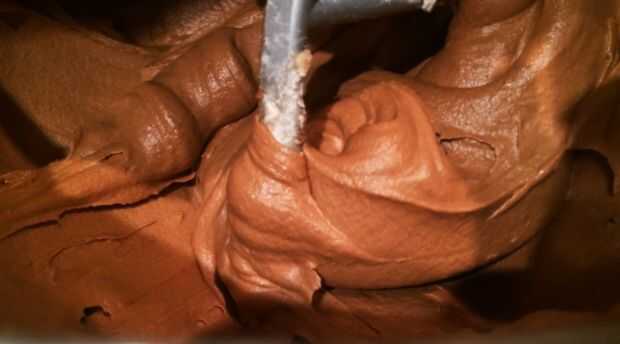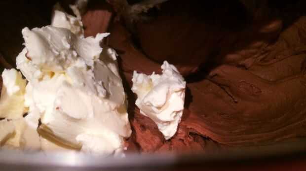 Mezclar el polvo de cacao y azúcar glas. Añadir la mantequilla, seguida por el chocolate oscuro derretido. A continuación, añadir el queso crema, seguido de la crema de vainilla y nata montada. Vencer en una velocidad alta por 10 minutos hasta ligero y mullido.