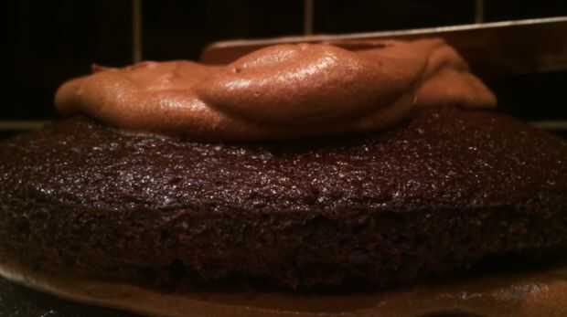 Pastel de chocolate oscuras estilo Nueva York es una de las tortas de chocolate más oscuras, más rico y más densas que nunca tenga el lujo de comer. Que consiste en capas de esponjoso pastel separados y cubierto por una escarcha de natilla-como grues