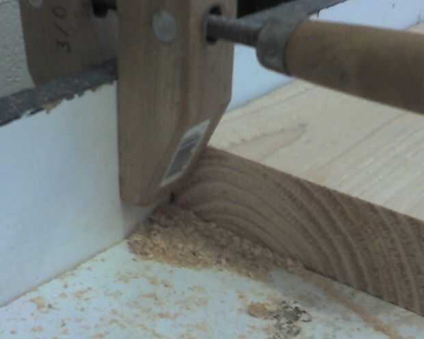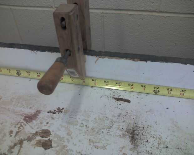 Establecer un tope en el brazo radial vio cerca a 29-3/4" por la fijación de un tornillo de mano pinza (o c-con abrazaderas un pedazo de madera de desecho) fijó por lo que es arriba de la mesa para proporcionar para la limpieza de viruta. De esta manera vio polvo recoger en la esquina y hacer las tablas más cortas y más cortas a medida que avanza.