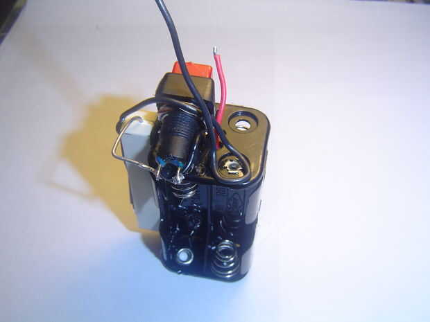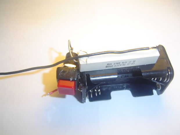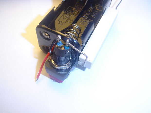 Toma su resistencia (o alta potencia LED circuito del conductor si usted construye uno, que se recomienda para la eficiencia) y pegar por el lado de la parte posterior de la batería. Dobla uno de sus cables a la otra terminal del interruptor y soldar allí.
