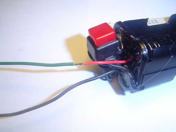Soldadura tres cables del conector de la siguiente manera: uno para el alambre del portador positivo de la batería, para el alambre del portador de negativo de la batería y otro para el terminal del interruptor donde la resistencia es. En la imagen los colores (en orden) utilizan para estos fueron rojo, negro, amarillo. No fue utilizado el cable azul. Pegue el conector por el lado de la batería sea el enchufe en la parte inferior.