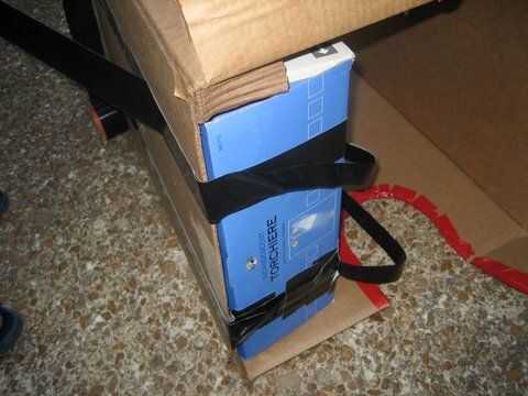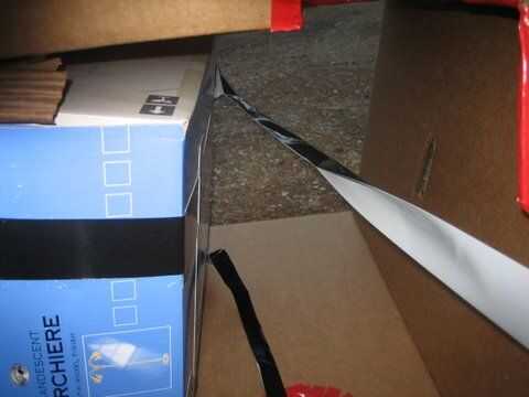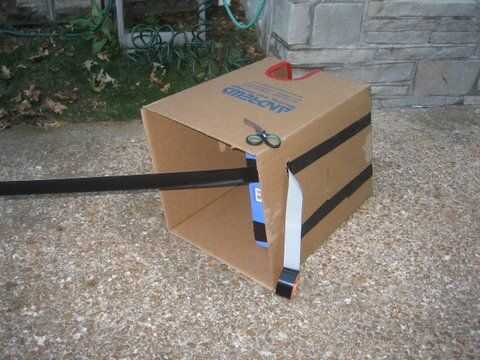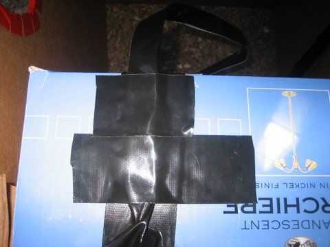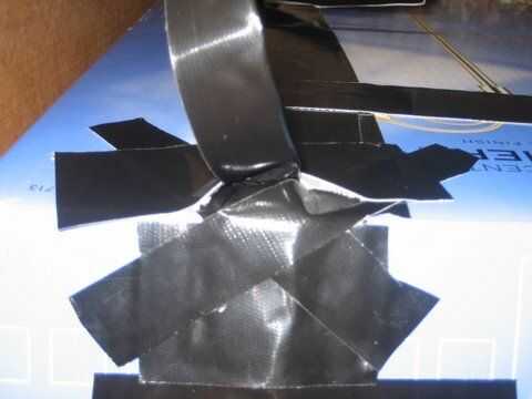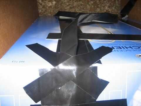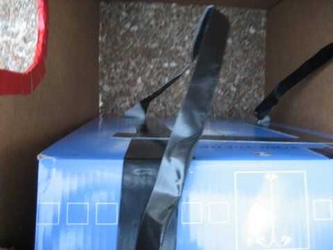 Ahora, en la parte superior de la caja (Figura 4), cinta dos trozos de cinta de conducto hacia los lados. (Foto 5)