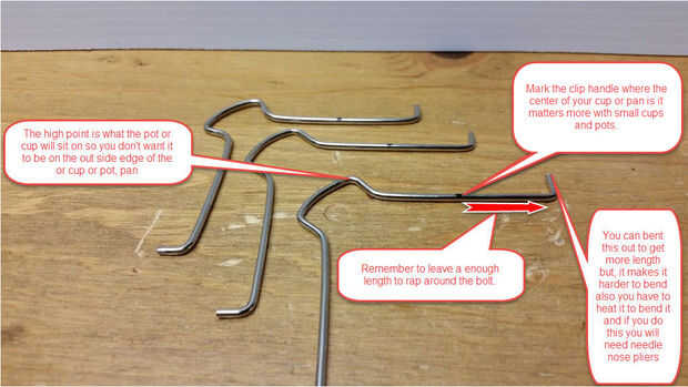 Ahora esta siguiente parte es dependiente en el tamaño de su olla o sartén deberás marcar los controles de clip a donde se doblará alrededor del perno, esto determinará el bote grande o pequeño es. (Ver foto de arriba para más detalles)
