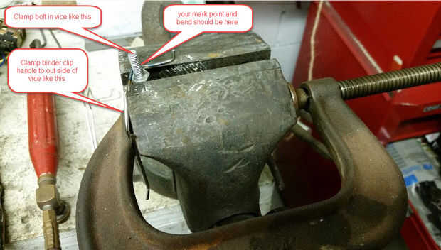 2. Sujete la primera de las manijas de tres clip al lado del vicio por lo que el punto donde ha marcado empezará la curva alrededor del perno. (Como se muestra en la foto de arriba)