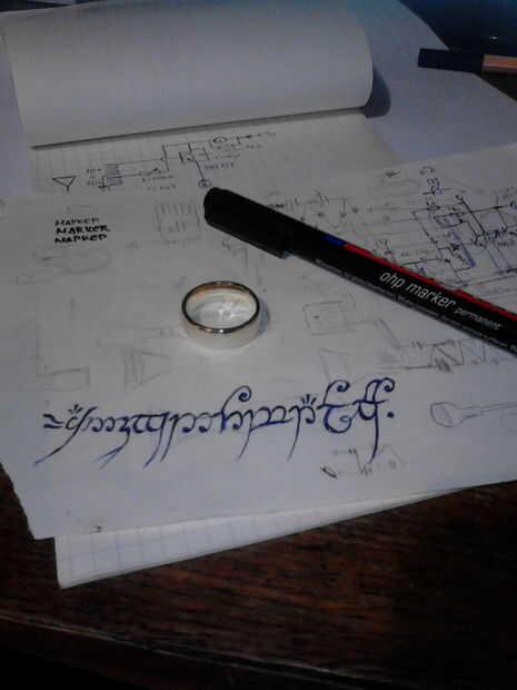 El siguiente paso es escribir el texto en el anillo. Google las inscripciones anillo uno y empezar a escribir élfico con marcador resistente al agua en el anillo.