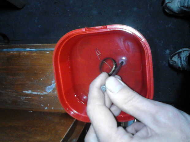 Anillo y el clavo de la inmersión en solución (no deben tocar anillo y clavo) y conecte a la fuente de alimentación. Cuando las burbujas minúsculas empiezan a salir – señal de que la electrólisis ha comenzado...