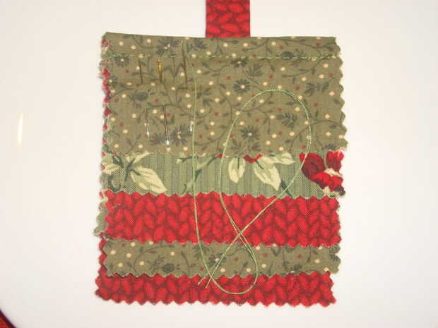 La imagen muestra 6 cuadrados aristas picado para encajar en un patrón de capas y la parte superior hacia abajo 1/4" dobladillo y cosida para un aspecto acabado. He añadido una pestaña en la parte de atrás y se cose al mismo tiempo que se cose el dobladillo. No es realmente necesario uno aunque. El pequeño pedazo de cartulina de 4" se pega a la espalda como un estabilizador.