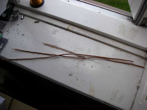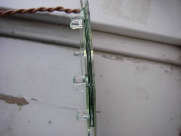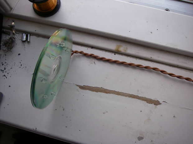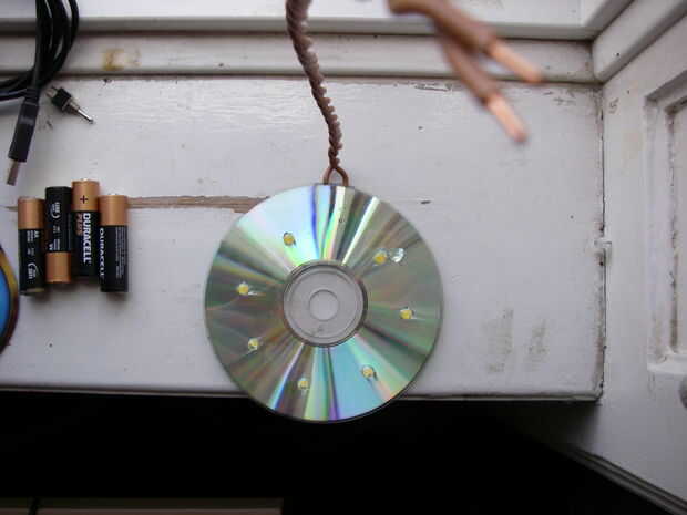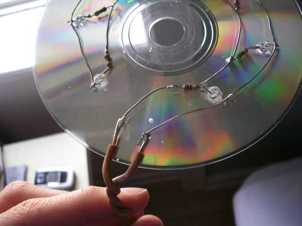 Pegar el segundo CD y el alambre rígido en el CD, donde se montan los LEDs. Esto se hace simplemente usando una pistola de pegamento caliente. Mueva su ratón sobre los cuadros amarillos para ver las instrucciones.