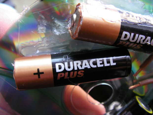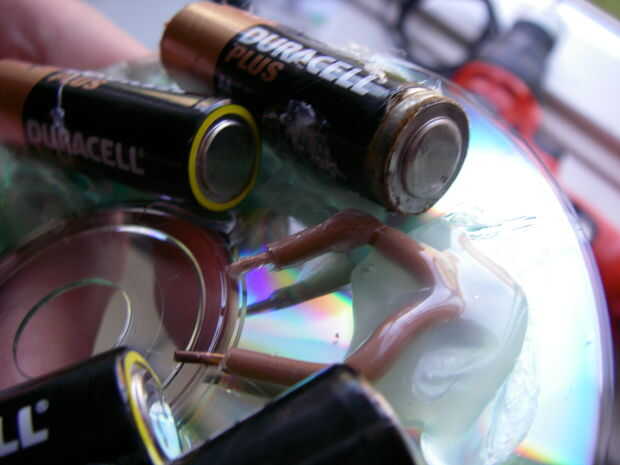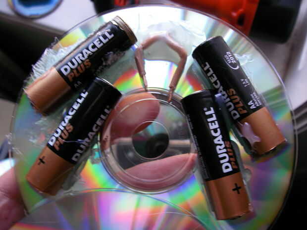 Ahora es el momento de montar los contrapesos (4 de 5 baterías). Simplemente pegar en una de mis armas favoritas: la pistola de pegamento caliente.