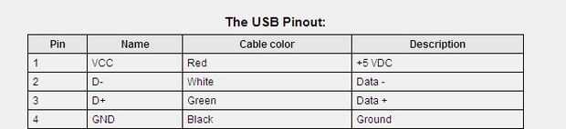 6. Conecte la varilla para el cable USB cable rojo a la barra positiva y el cable negro a la barra negativa. Por favor consulte http://pinouts.ru/Slots/USB_pinout.shtml si es necesario. Corto las líneas de 2 datos.