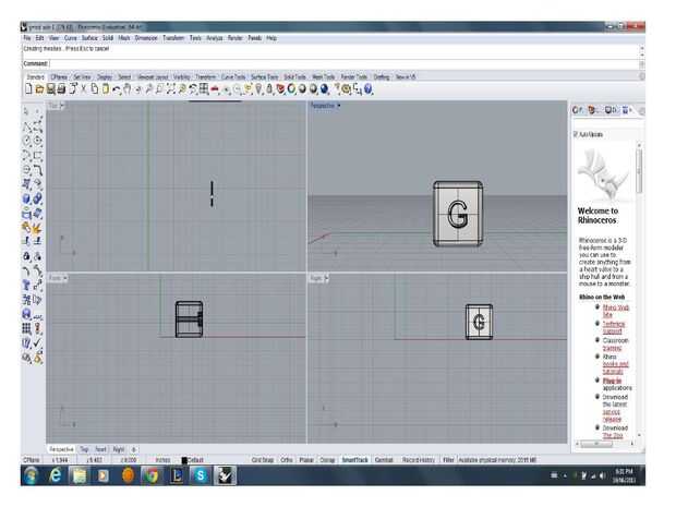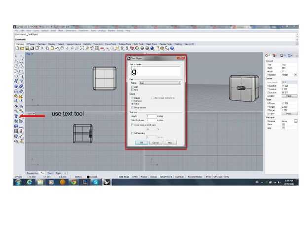 Utilice la herramienta texto para crear la letra y tener las dimensiones que desee, presione el botón Ok después. Utilice la herramienta diferencia grabar la letra en el cubo.