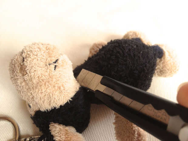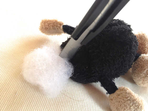 Tomar un cuchillo o un cortador y corte cuidadosamente abra la costura alrededor del cuello de las ovejas. Una vez que la cabeza esté apagado, cuidadosamente abra la costura en la parte posterior del principio de ovejas en el cuello y abierta para aprox. 1/3 de la longitud del cuerpo.
