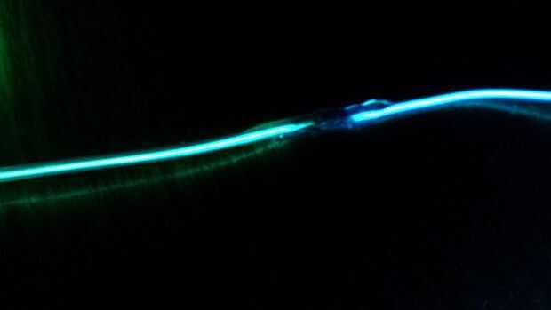 El alambre tiene un alambre de cobre rígido en el centro y una delgada "alambre de corona" envuelve el material de emisión de luz.