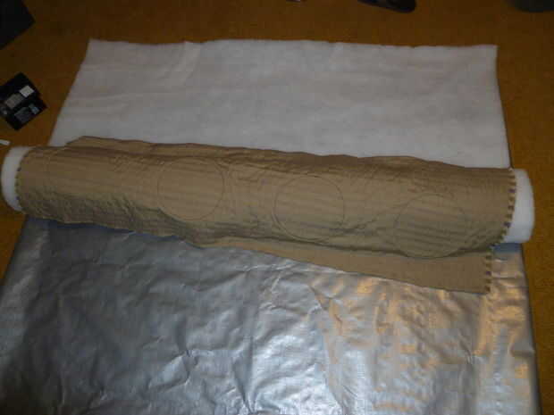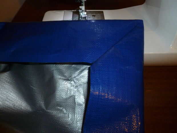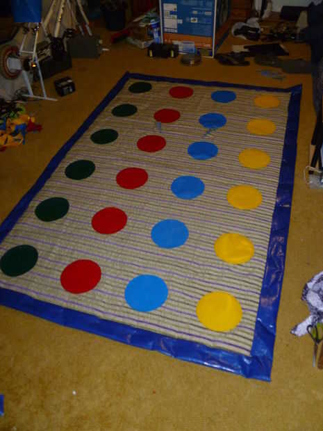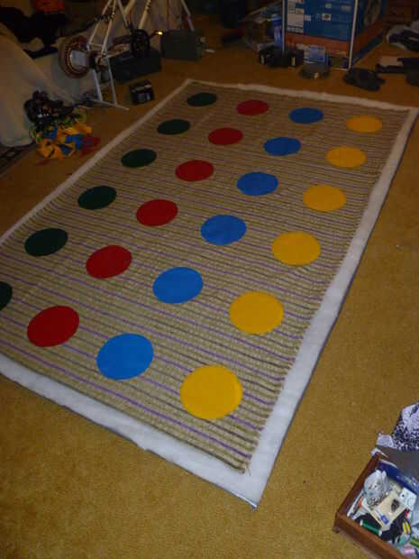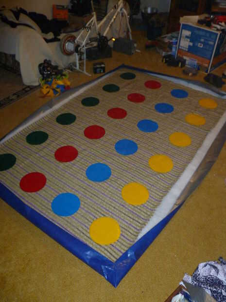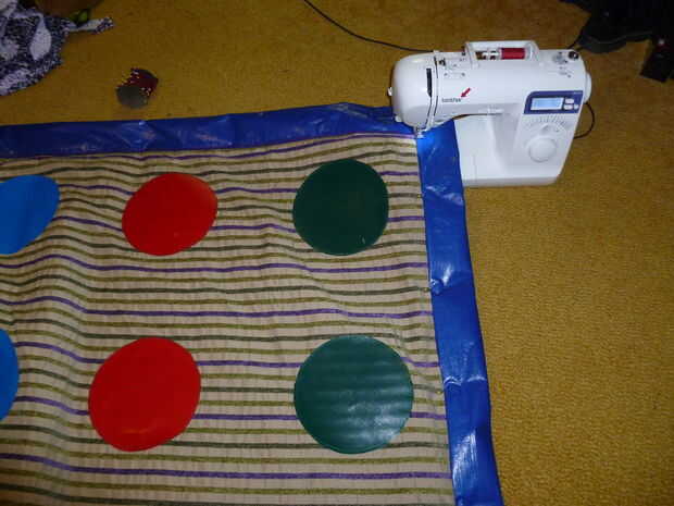 Una vez que todo se ajusta a derecho, coser por el detalle de la esquina de lona como la demostración de los cuadros. Luego pegue el bateo a la lona con el adhesivo en aerosol, si no que te resbale alrededor de demasiado mientras estás jugando twister.