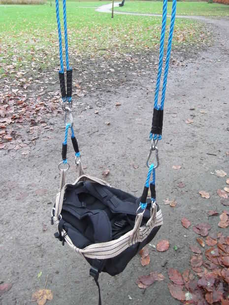 Hice un giro que usted puede poner fácilmente dentro y fuera de la mochila. Es fácil de poner en un árbol, con algo de práctica que va muy rápido. Si las cuerdas son para mucho tiempo usted puede hacer más corto. Y lo gracioso es que la mochila no pone en el suelo pero es de hecho que hace pivotar en él, por eso se llama un 'swing mochila'.