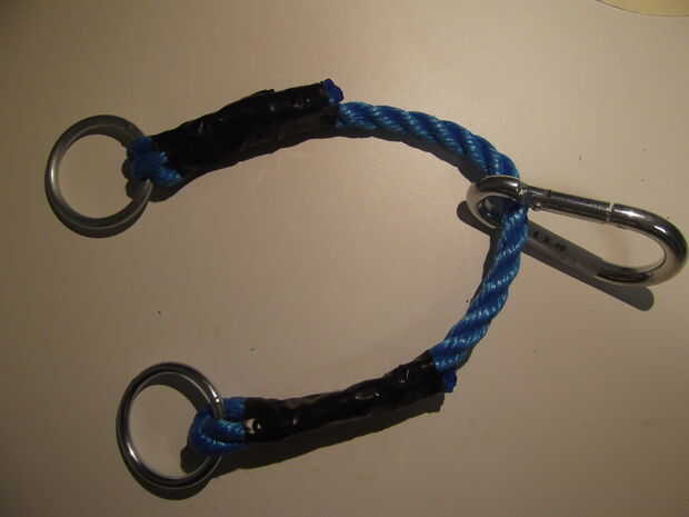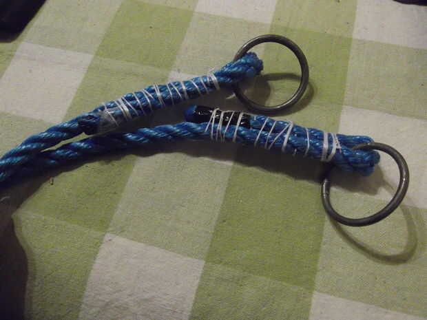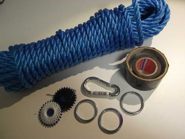 Necesitamos la cuerda de 20 metros de largo azul, 8 anillos de metal, cinta, hilo más ligero, fuerte y una aguja que cortamos 2 x 60cm, éstos forman 2 lazos que conectarán la cuerda alrededor de la rama con el vaivén de la misma.
