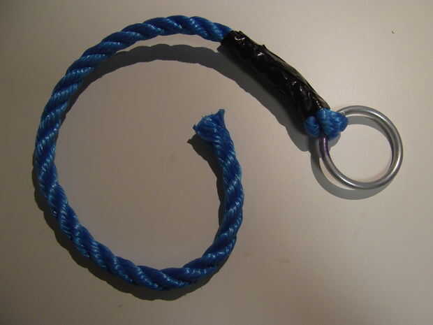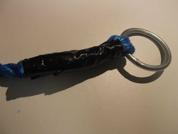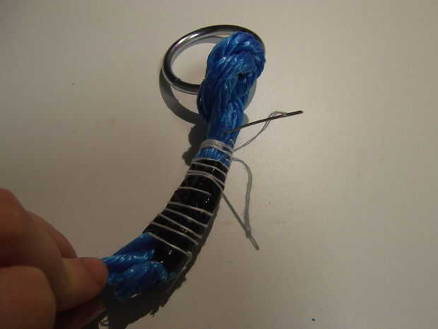 Foto 4: ahora el anillo está en la cuerda, coser la cuerda hacia atrás juntos. Esto puede ser difícil, ser cuidado es fácil de romperse la aguja.