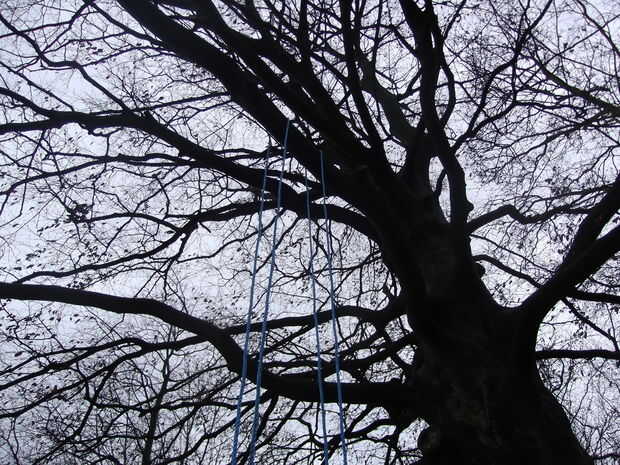 Ahora antes de que usted va a un anillo de la cuerda alrededor de la rama en el gancho de seguridad, haga clic en, tienes que ir con el a través de la cuerda del mosquetón del lazo azul y haga clic en el gancho que está en la cuerda. no vas primero a través del mosquetón del lazo azul, usted la cuerda hacerla más larga, lo que una solución es si el árbol es a alto.