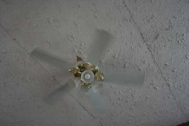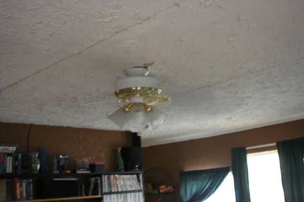 OK, primero lo que necesita es un ventilador de techo. Solo que pasa que tengo una hoja cinco en mi sala de estar. Es blanco con detalles en latón. El único problema que veo ahora es lo que Hades voy a hacer con el ensamblaje de la luz. Supongo que será un reto extra para este proyecto.