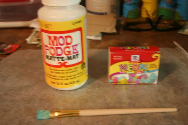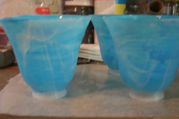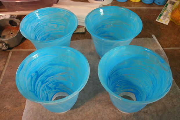 Freutcake - pero algo modifico la receta. He utilizado mate Mod Podge y colorante azul neón, pero no hay agua. Entonces sólo rozó en, dentro del vidrio. Tres capas y un montón de tiempo de secado. No estaba segura de cómo manejaría los pedacitos de vidrio que mucho calor, así que no pongo en el horno, solo les secado al aire.