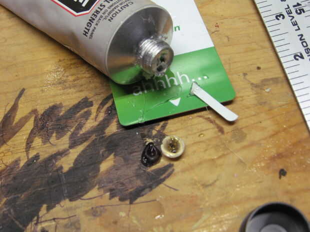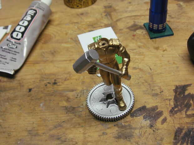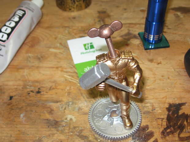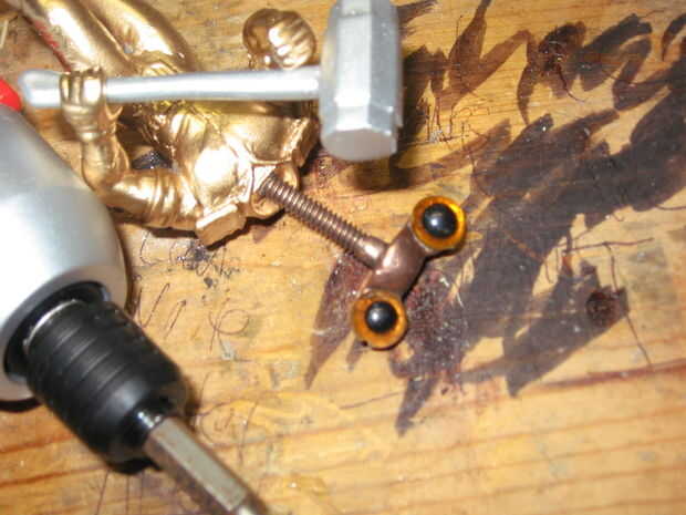 Ahora nos podemos juntar el verdugo. Taladrar el tornillo en la base y luego en el agujero en el talón. Luego enrosque el tornillo en el agujero del cuello. Gírelo hasta que golpea el tornillo central que sostiene el cuerpo juntos. Si escucha grietas detrás del tornillo de media gire de manera que no divide nuestras costuras selladas para arriba y juntas. Use pintura clara para sellar la figura. Una vez que lo hace uso E-6000 para pegar los ojos a las alas del tornillo.