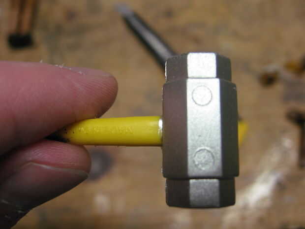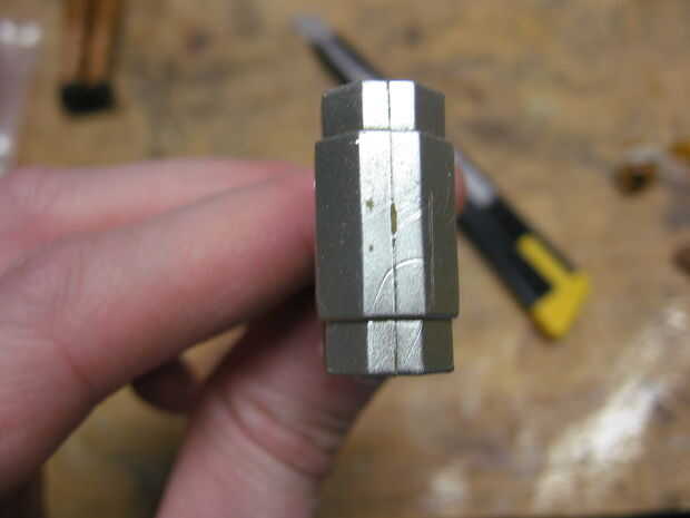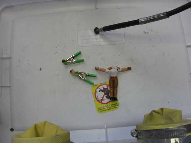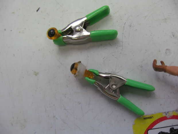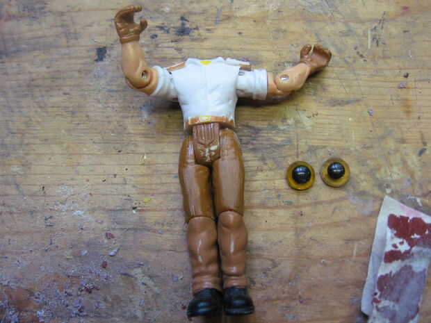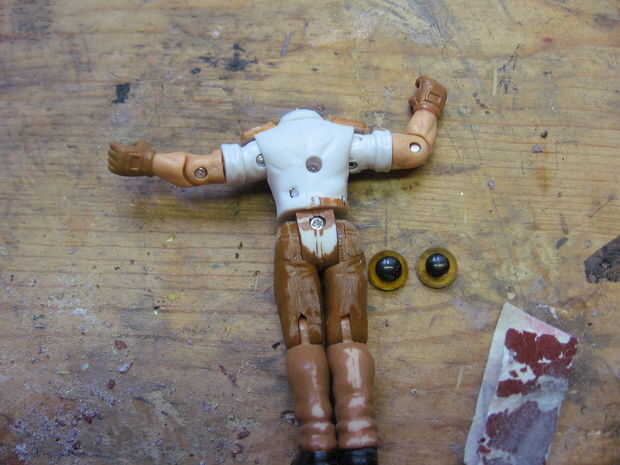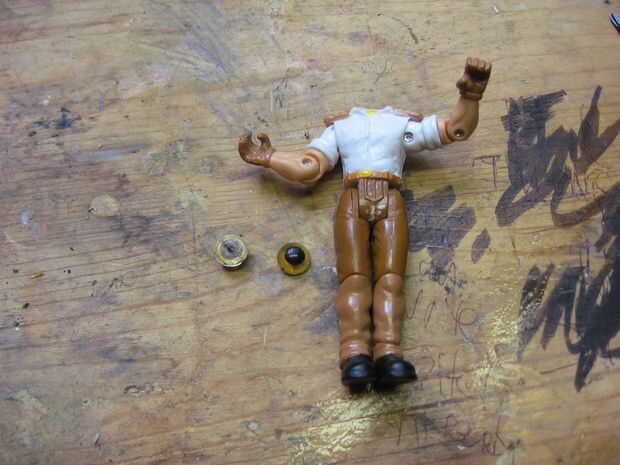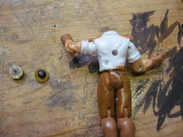 Primero utilizar una dremel y cortar ruedas para eliminar la base de los ojos a hacer plana la parte de atrás de los ojos. Utilice abrazaderas de resorte para sostener los ojos para que pueda mantener que los dedos alejados de la dremel. Una vez que los ojos se hacen uso la dremel para quitar cualquier indeseables características. En mi caso me lo quitaron el micrófono de radio y del hombro del cinturón.