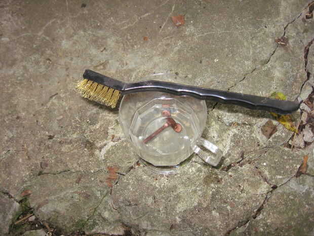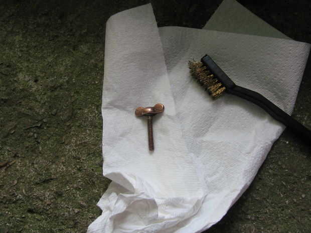 Con el resto de la figura bajo control tenemos que limpiar la cabeza. Coloque el tornillo de pulgar en vinagre. Yo déjelo remojar durante la noche y luego utiliza un cepillo de alambre para eliminar tanto la suciedad de la superficie como sea posible.