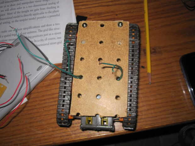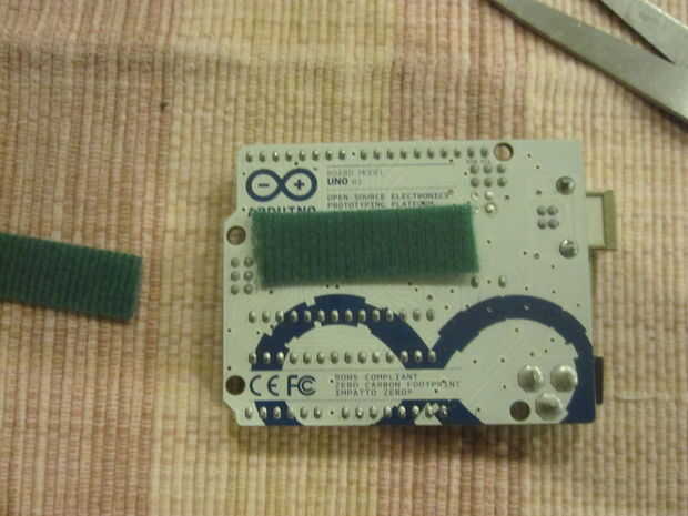 para montar los componentes electrónicos, jodido otro pequeño pedazo de pegboard a las piezas de se utiliza para mantener el eje delantero. Caliente pegué el puente H abajo y el velcro el arduino para poder quitar fácilmente para su uso en otros proyectos.
