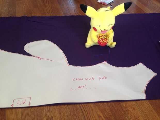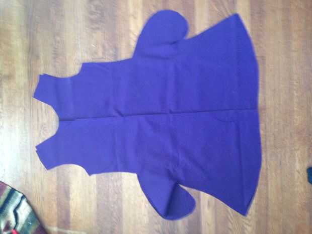 Asegúrese de que la tela se dobla por la mitad longitudinalmente. Colocar sus piezas en el pliegue, como en la foto de arriba. Cortar el cuello, las costuras hombros, sisas, lados, bolsillos y parte inferior, pero no cortar el doblez.