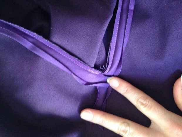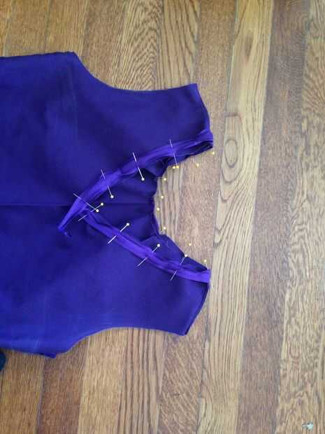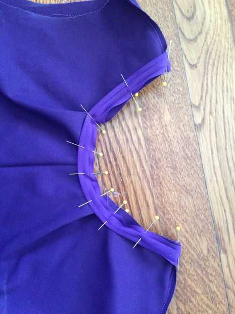 Una vez hayas hecho el escote muy complicado, que vas a hacer lo mismo para las sisas. Inicio de la cinta de bies en la parte inferior de la axila. Pines lado derecho al lado derecho, coser el doblez. Dale la vuelta, pin juntos y coser la cinta hasta el final de la sisa.