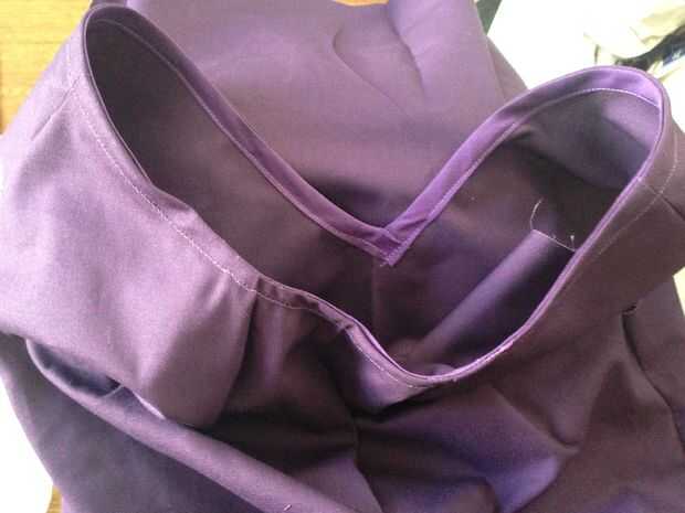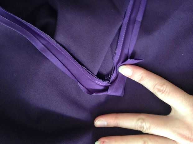 Una vez que ha cosido esa costura, doble la cinta por lo que la cinta está en el interior del vestido. El exterior de la línea del cuello será la tela principal y en el interior, verás la tira de cinta de bies. Perno doblado su cinta en el interior bajo. Otra vez, si se confunde, mira las fotos. En el cuello, tome el extremo corto y doblarlo por lo que se dobla en el extremo más largo de la cinta.