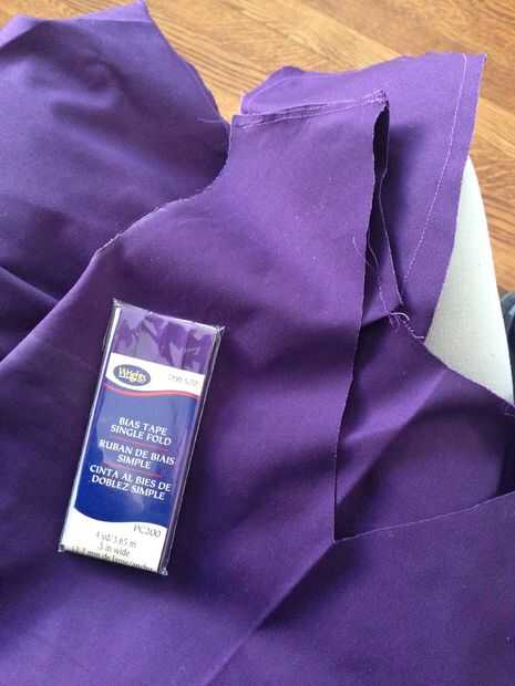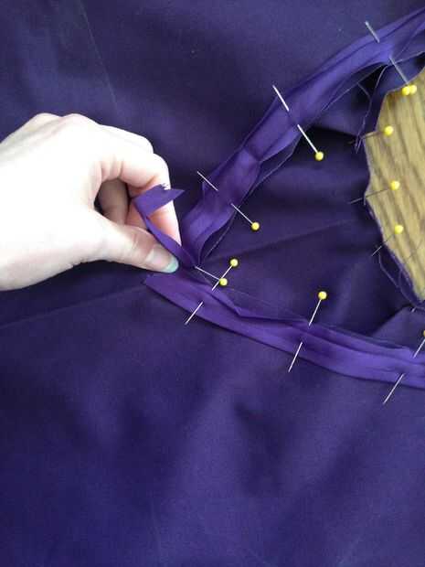 Este es el paso más complicado! Tome su correspondiente cinta y desplegarlo. Empezar a fijar alrededor de su cuello, lado derecho del vestido (costuras dentro) a derecha lado de escote (a coser la cinta bies para que quede frente a usted, luego darle la vuelta bajo por lo que el interior). Bis la cinta tiene tres pliegues (doblez de centro y dos pliegues a cada lado). Vas a alinear el primer doblez con el borde de su vestido y coser el doblez de la cinta. Es difícil de explicar, así que he incluido un montón de fotos!