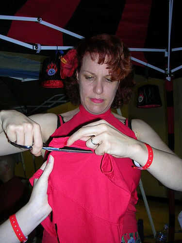 2D. de tela restante de la 1 º camiseta, corte un tubo de tela (lo suficientemente amplia para colocar en Imperio costura y cubierta apenas por debajo de la cintura natural. Cortar tubo abierto (cintura Tie-Cinch) y fije el centro al medio frente de halter en la costura del Imperio; cosa frente juntos, termina poco más allá de los lados (extremos dejar colgando de la cintura Tie-Cinch; este llegará a ser un lazo en la espalda).