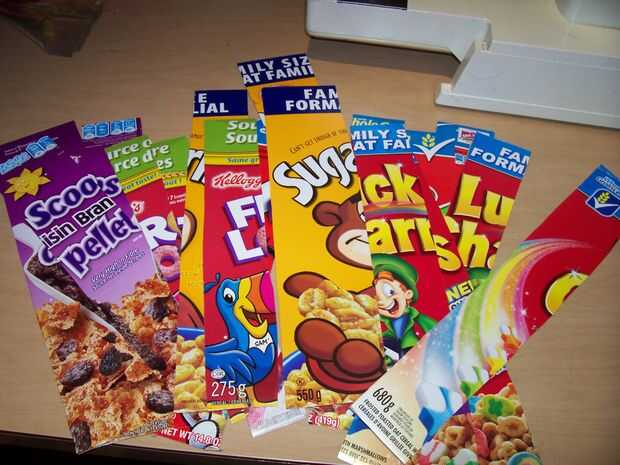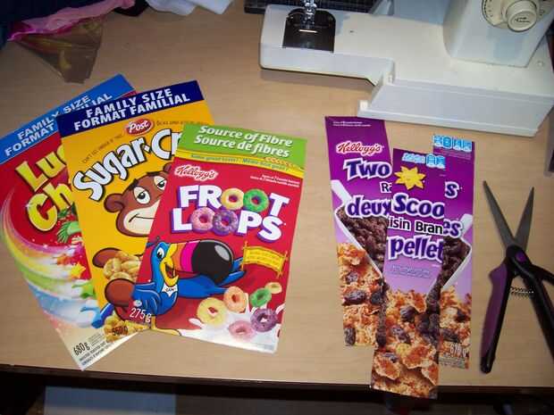 Para las cajas de cereal, - corte las tapas apagado (la parte delantera de la caja de cereal) y cortar las tapas en tiras.